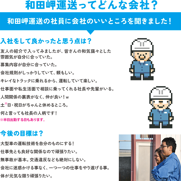 労働時間のほかにも、車両・人間関係・給与など常に改善しようと努力しています。 充実の福利厚生もあり、大手造船所の専属企業のため、安定した経営基盤の会社です。